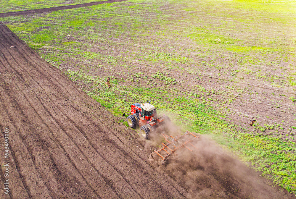 Samolepka Aerial view of agricultural tractor doing stubble field fall tillage on farmland