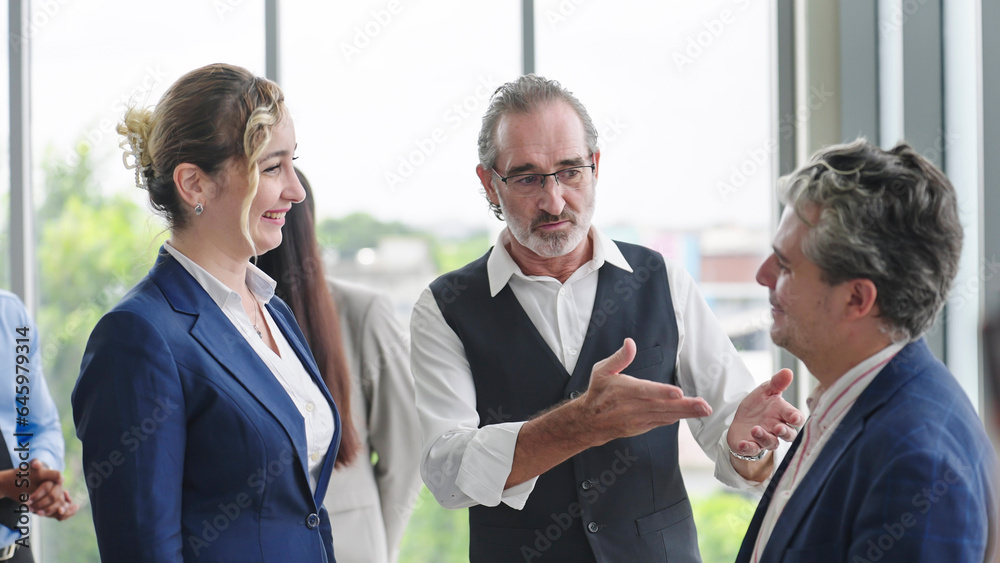 Samolepka Caucasian man leader introducing woman manager to new team partner at seminar of company