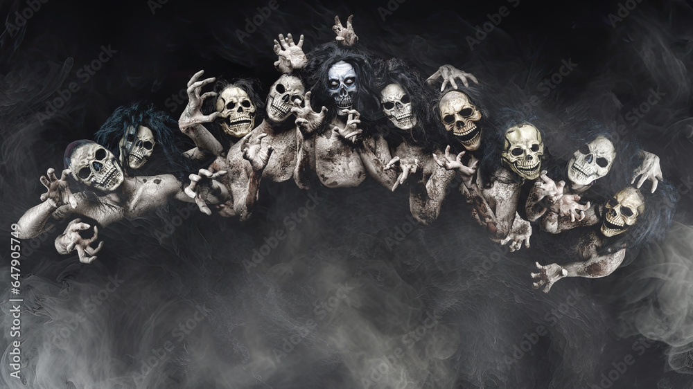 Samolepka A group portrait of individuals in ghost costumes with skull faces, set against