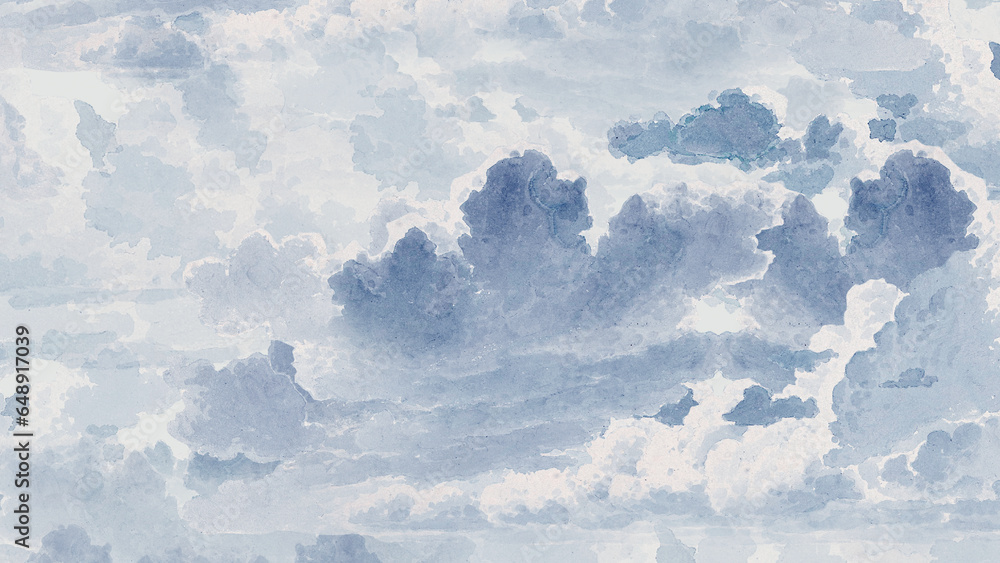 Samolepka A dreamy watercolor background of fluffy, billowing clouds in a pale blue sky