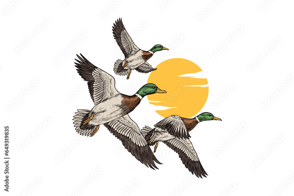 Samolepka Vector Illustration Logo of three Flying Ducks, vintage colors