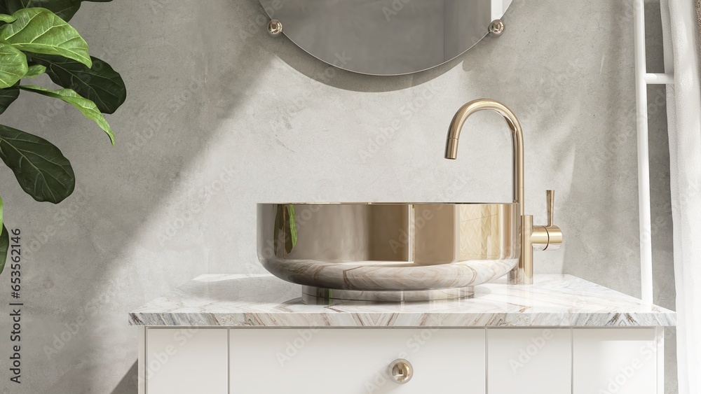 Samolepka Bronze washbasin on marble vanity counter top, gold faucet, round mirror in sunl