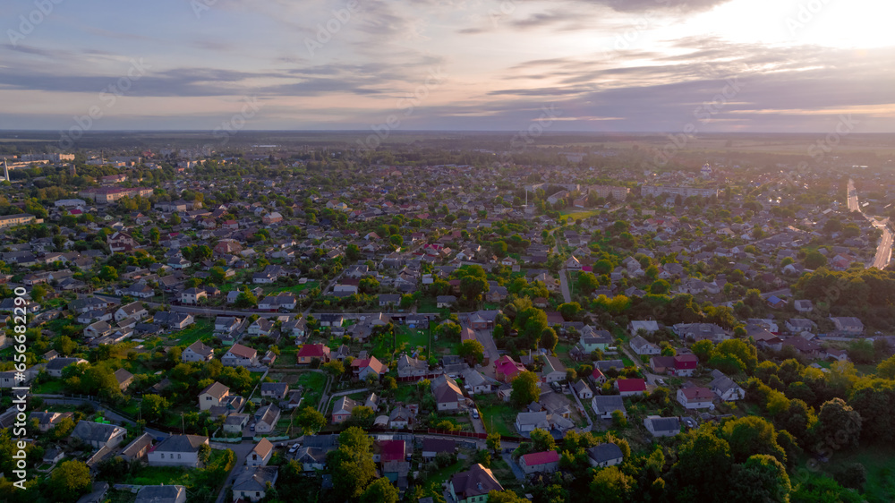 Samolepka peaceful aerial living district of suburban cottages outskirts city area sun ris