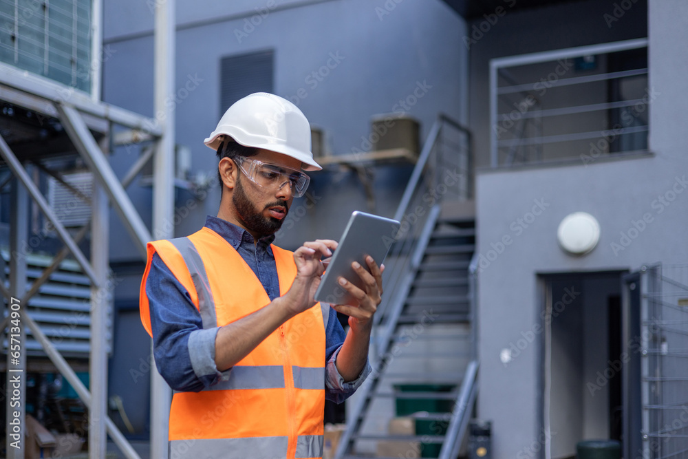 Samolepka Serious thinking and focused engineer working in factory in hard hat and vest, man using tablet computer reading diagram, and checking equipment, inside industrial factory