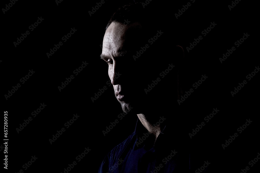 Samolepka Portrait of a thoughtful man with chiaroscuro, a rocky and convex face, alone in