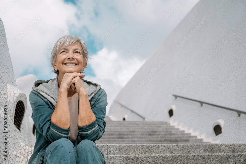 Samolepka Handsome happy senior woman sitting outdoors on staircases looking away, elderly