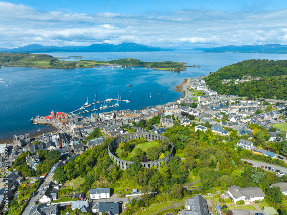 Samolepka Luftbild der Hafenstadt Oban mit dem McCaig's Tower