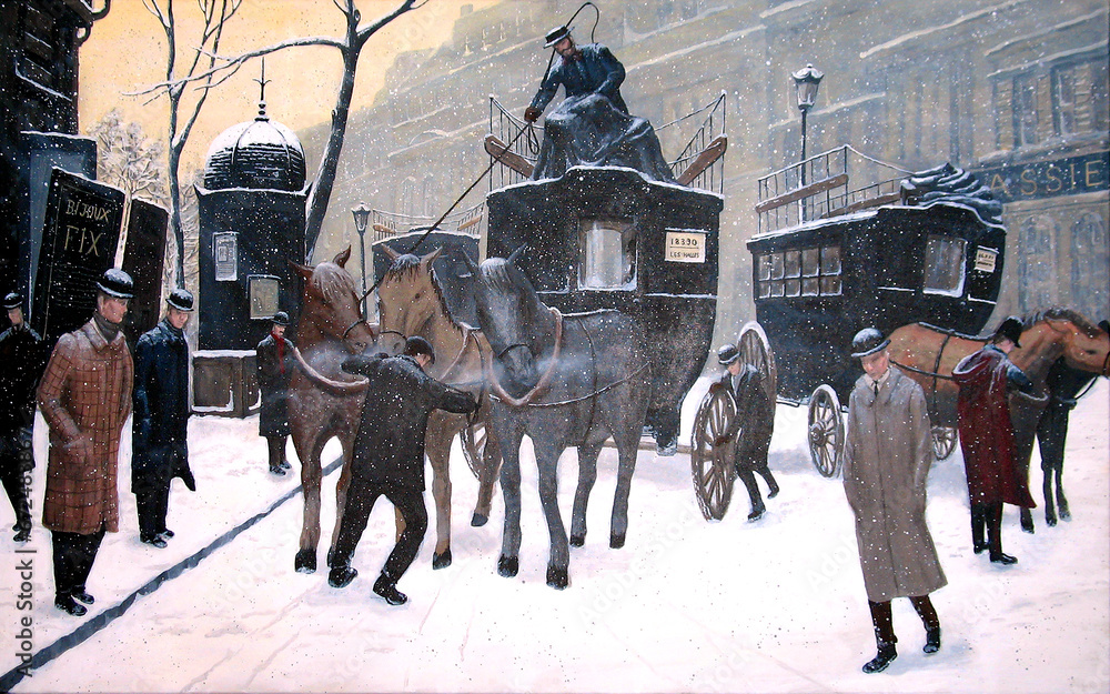 Samolepka Vintage scene of horses and carriages navigating the snowy streets of Paris