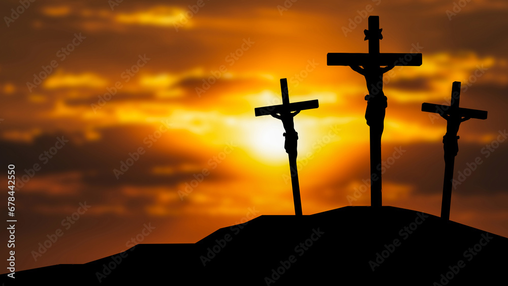 Samolepka The Crucifixion Of Jesus Christ in twilight sky 3d rendering.