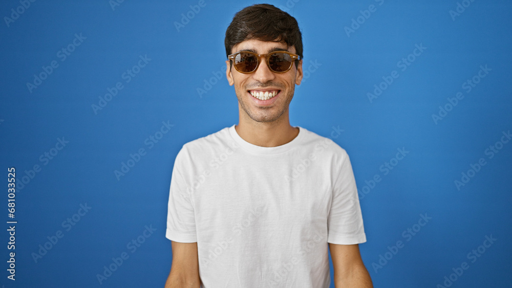 Samolepka Cheerful young hispanic man wearing sunglasses, exuding confidence and positivity, standing against an isolated blue background while enjoying a cool, casual lifestyle