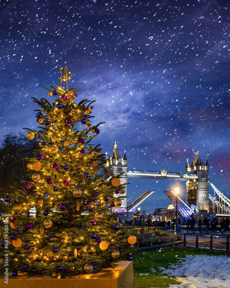 Samolepka A illuminated Christmas Tree in front of the famous Tower Bridge of London, Engl