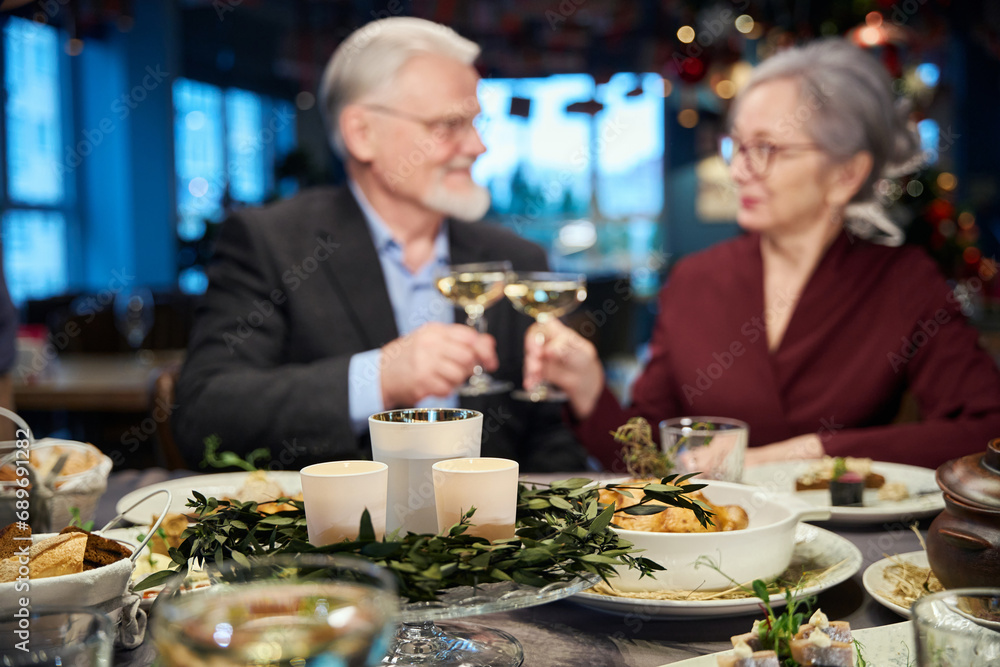 Samolepka Elderly couple celebrating New Year Eve together clinking glasses with champagne