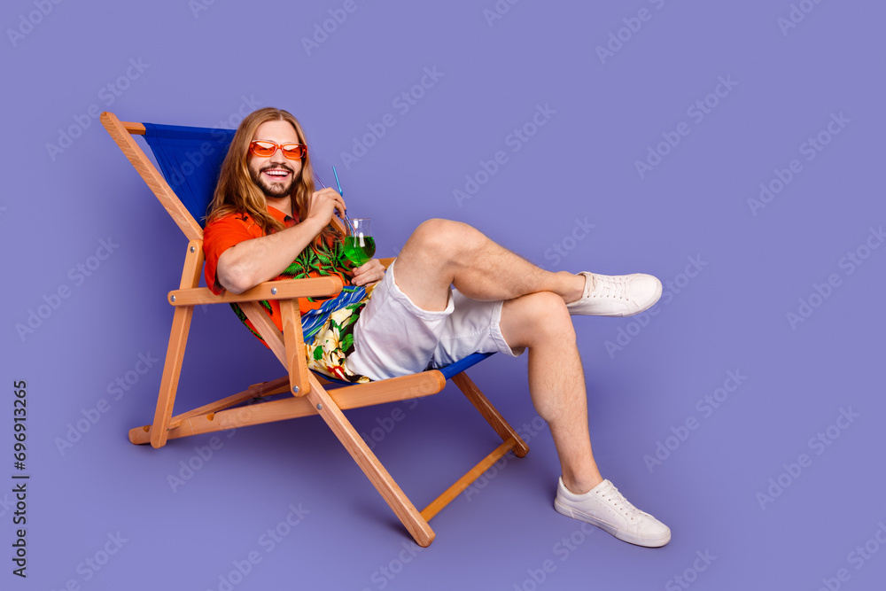 Samolepka Full length photo of good mood man dressed print shirt lay on deckchair on vacat