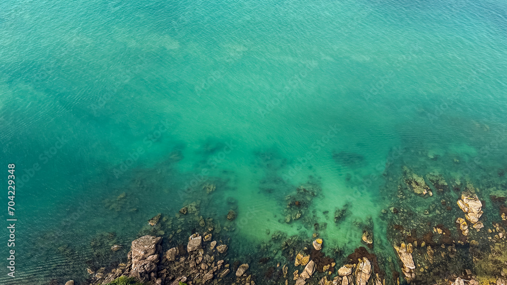 Samolepka Aerial view of a tranquil, clear turquoise sea gently lapping over a rocky shore