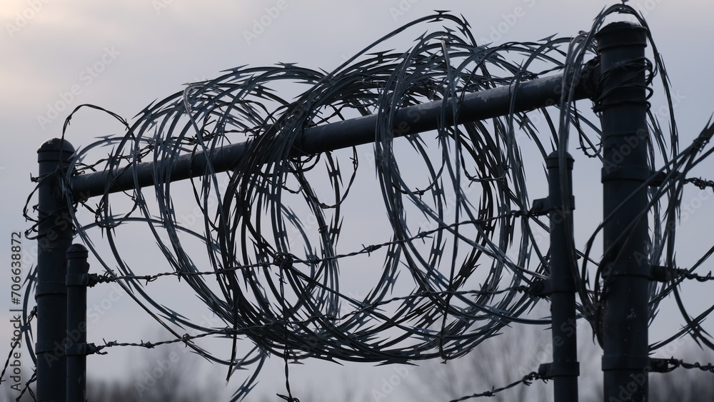 Samolepka Grim, depressing and bleak grey view of sharp razor wire rolls on top of barbed