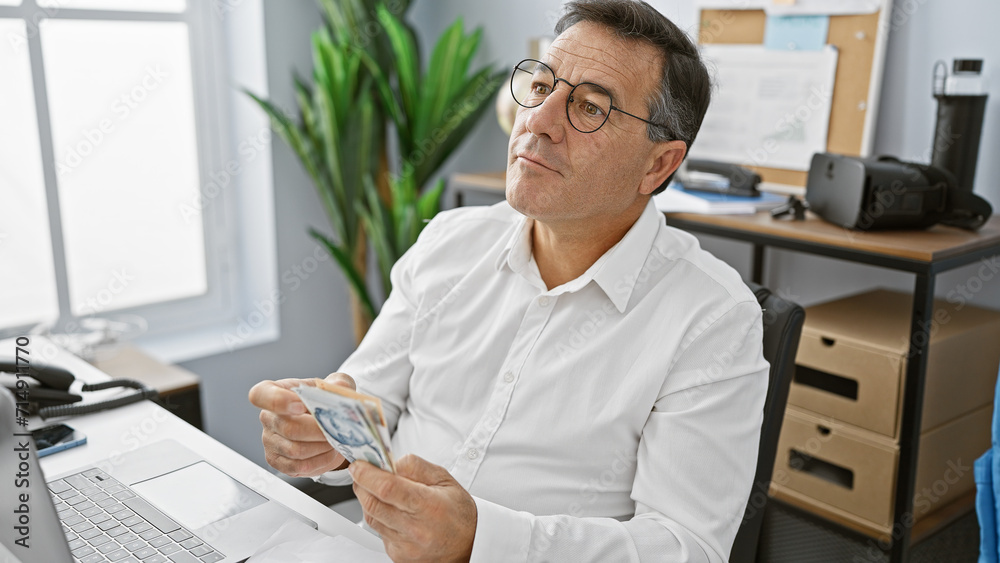 Samolepka A mature man counts singapore dollars at his office, showing a financial scene full of concentration and professionalism