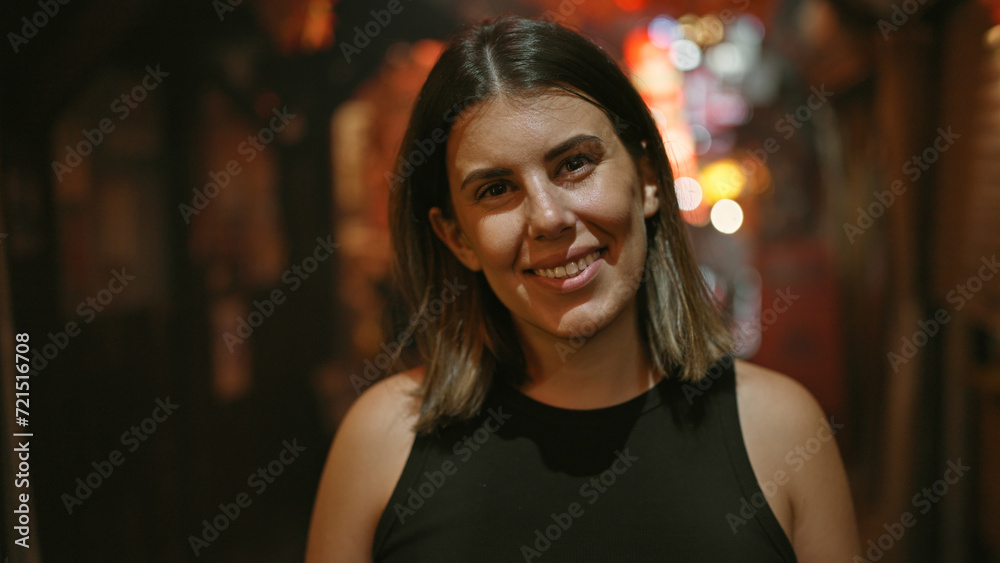 Samolepka Laughing into the tokyo night, joyful, confident hispanic woman brightens shinjuku's omoide yokocho with her carefree smile