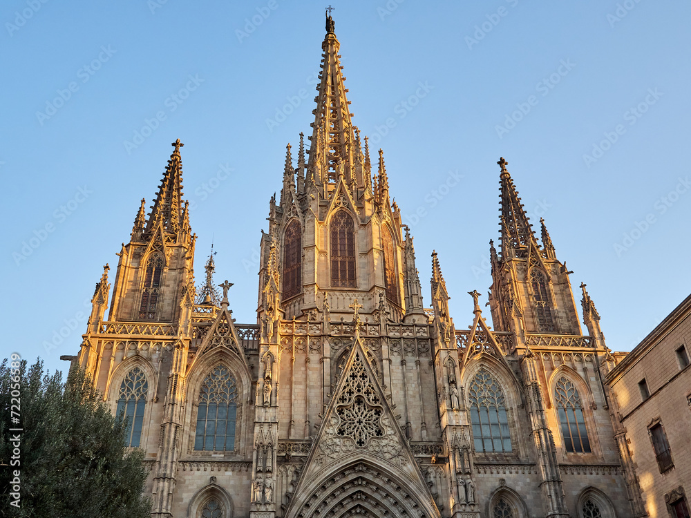 Samolepka Facade of the Cathedral of the Holy Cross and Saint Eulalia (Catedral de la Santa Creu i Santa Eulàlia in Catalan) at sunset