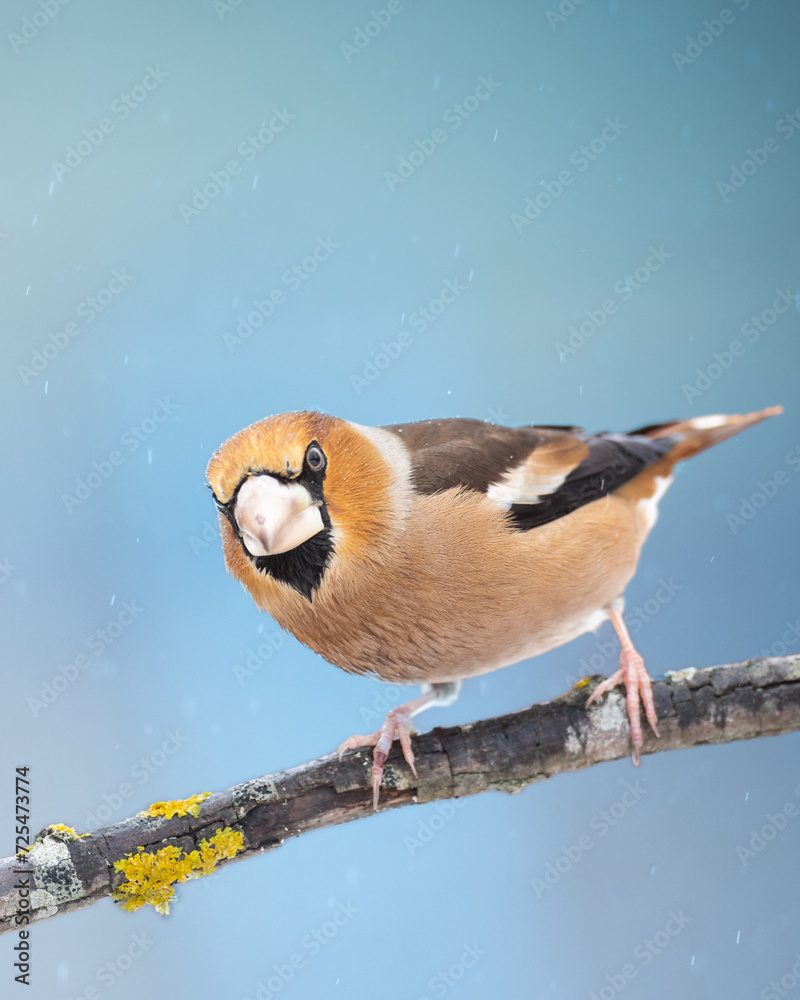 Samolepka Hawfinch Coccothraustes coccothraustes amazing bird perched on tree blurred back