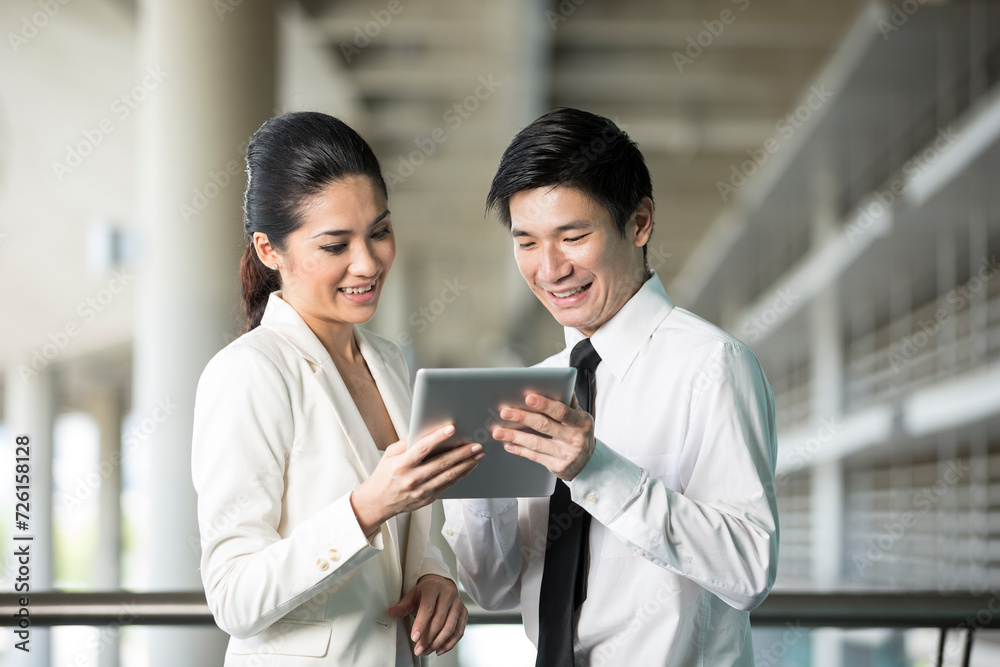 Samolepka Asian Businessman and woman using tablet.