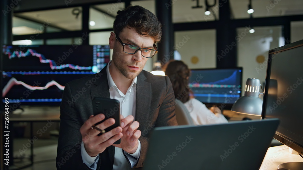 Samolepka Stock trader holding smartphone work in office
