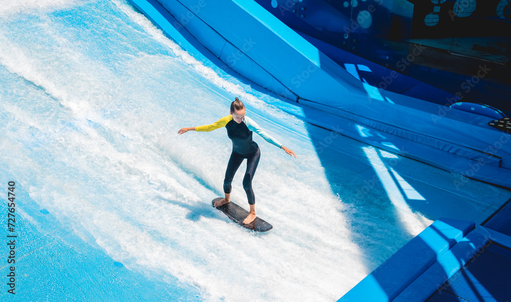 Samolepka Beautiful young woman surfing on a wave simulator at a water amusement park
