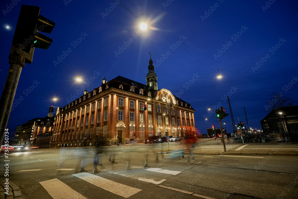 Samolepka Copenhagen at dusk. Night city. People at the crossing.