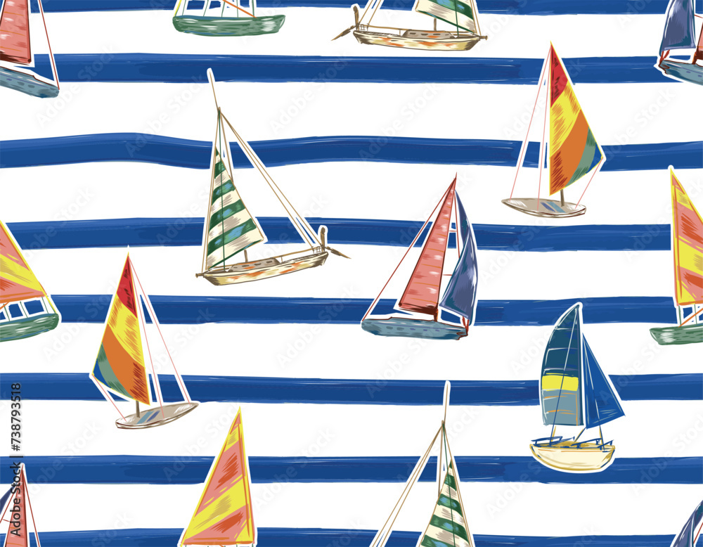 Samolepka Blue Brush stroked stripe with hand drawn sailboats seamless pattern nautical mo
