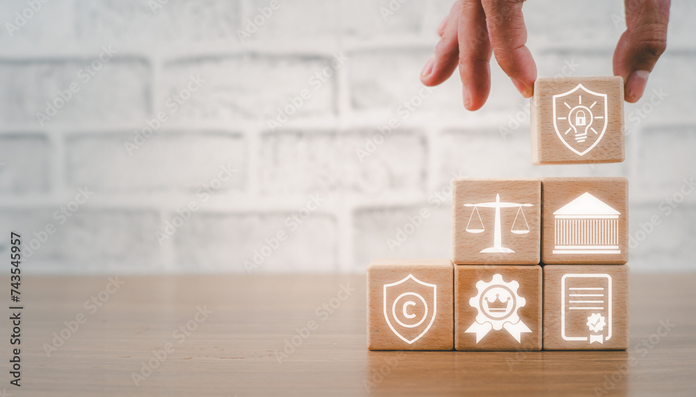 Samolepka Intellectual property concept, Hand holding wooden block on desk with intellectual property icon on virtual screen