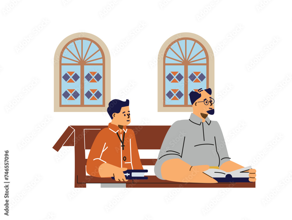 Samolepka Praying people on benches with Bible in church, Christian religious father and s