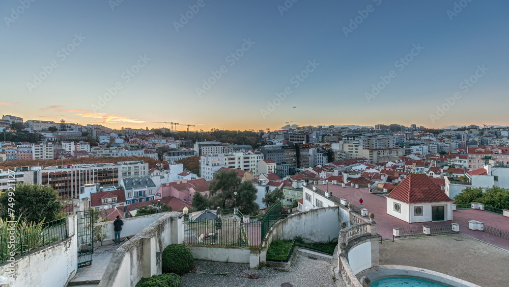 Samolepka Panorama showing Jardim do Torel day to night timelapse with views to the city center of Lisbon after sunset