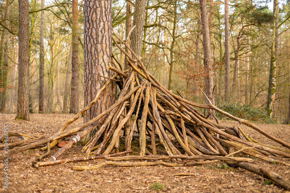 Samolepka A self-built wooden hut in the forest at a forest clearing