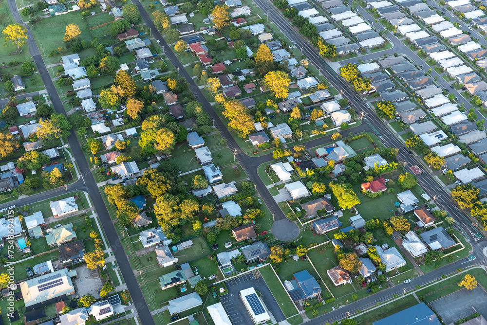 Samolepka Vue aérienne au lever du jour d'un quartier résidentiel près d'Ipswich, Queensland, Australie