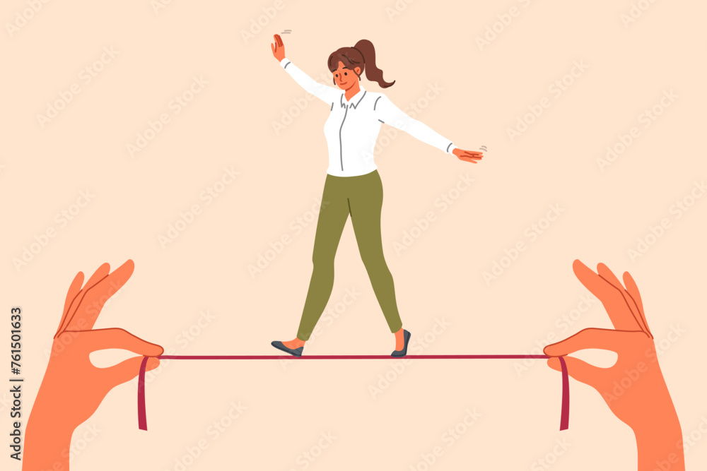 Samolepka Businesswoman takes risks, walking thin tightrope in hands of employer, demonstrating ability to balance while achieving goal