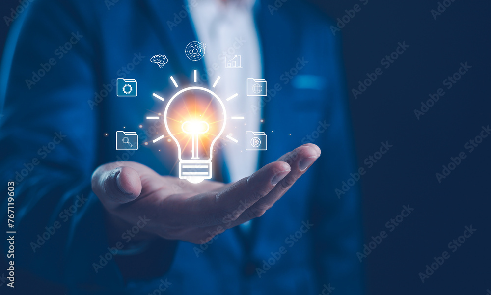 Businessman holding a magnifying glass that illuminates a light bulb icon, representing insight, innovation, and the search for bright ideas in the corporate world. Business solution idea concept.