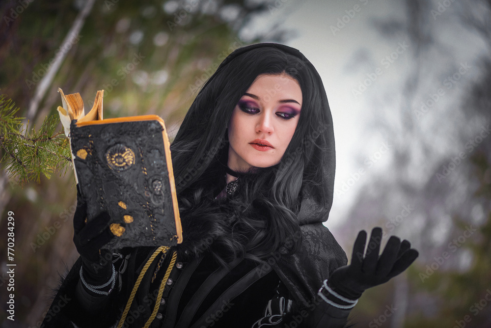 Samolepka Beautiful young enchantress walking in the winter forest.