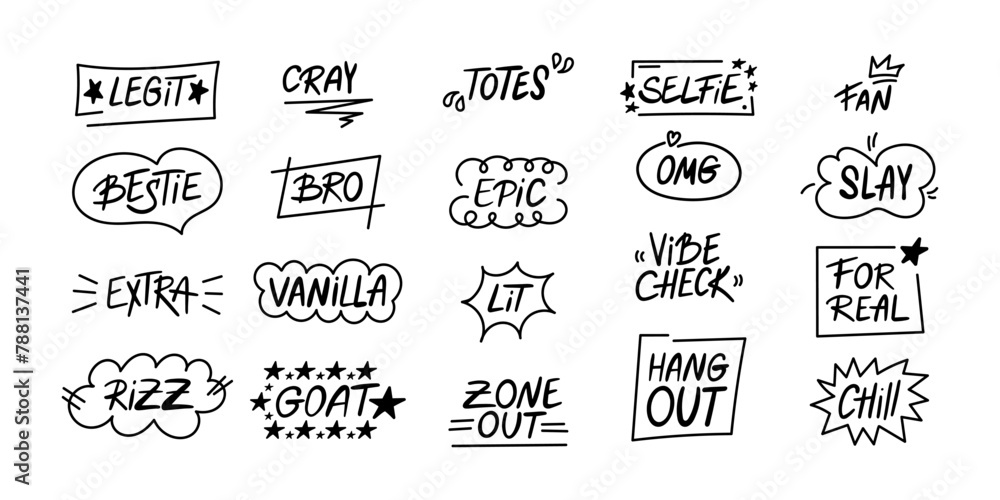 Samolepka Set of slang words, hand drawn lettering of modern short phrases