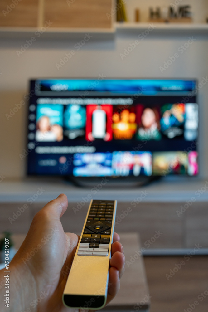 Samolepka Hand of unrecognizable person holding remote control with television in front