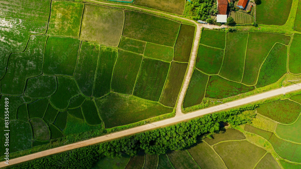 Samolepka Aerial view of verdant rice terraces with a meandering road, showcasing sustaina