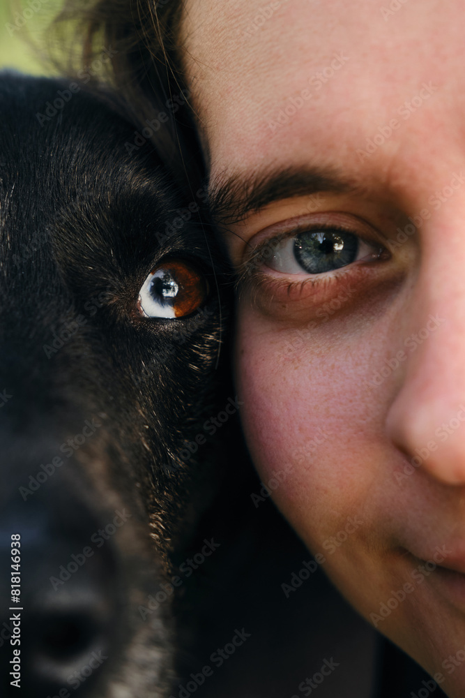 Samolepka Blue eyed woman and black heterochromia eyed dog close up in a natural setting