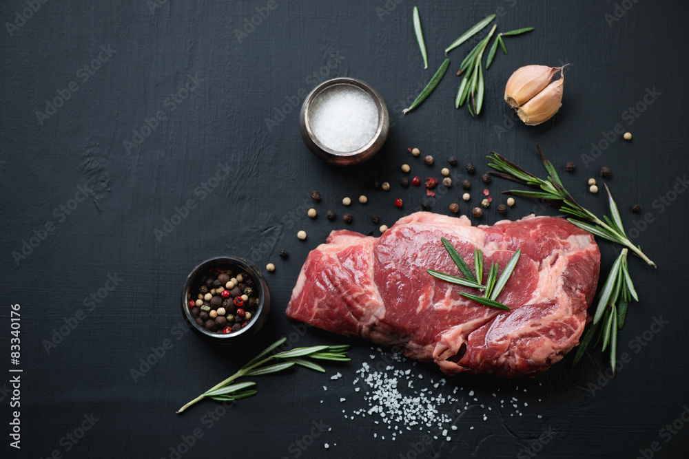Above view of raw ribeye steak with spices over black background