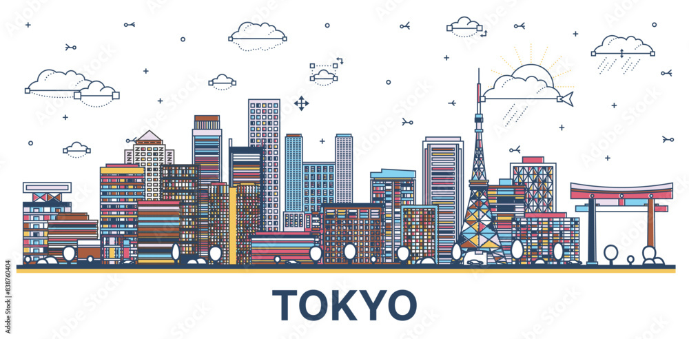 Samolepka Outline Tokyo Japan city skyline with colored modern and historic buildings isolated on white