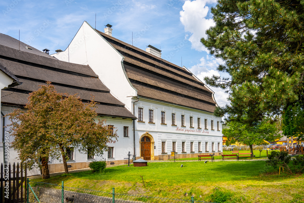 Samolepka A white building with a distinctive roof, part of a historic paper mill in Velke Losiny, Czechia