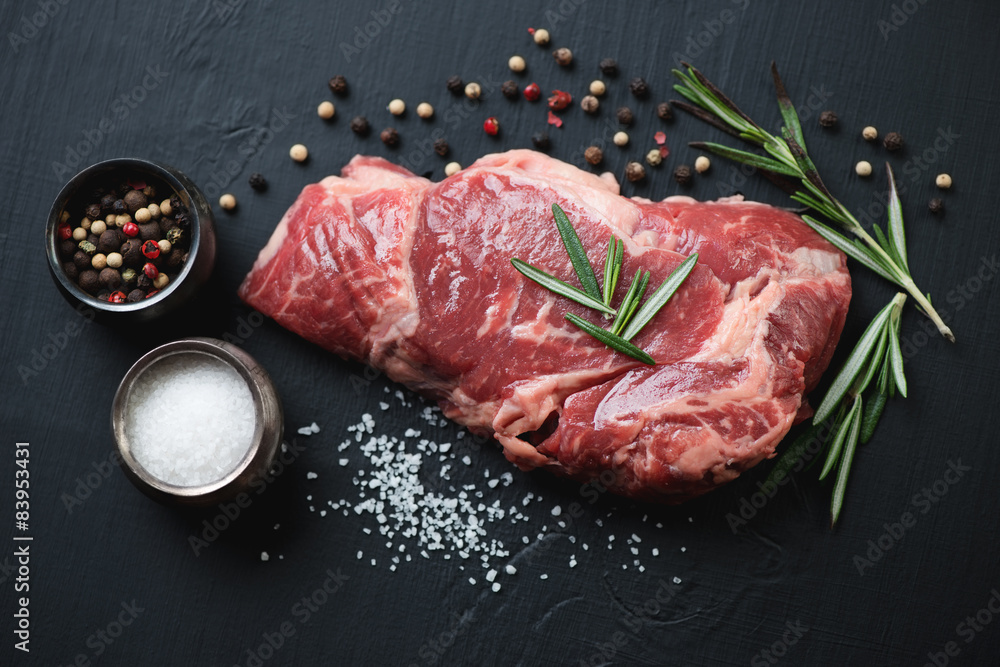 Raw ribeye steak with seasonings over black wooden surface