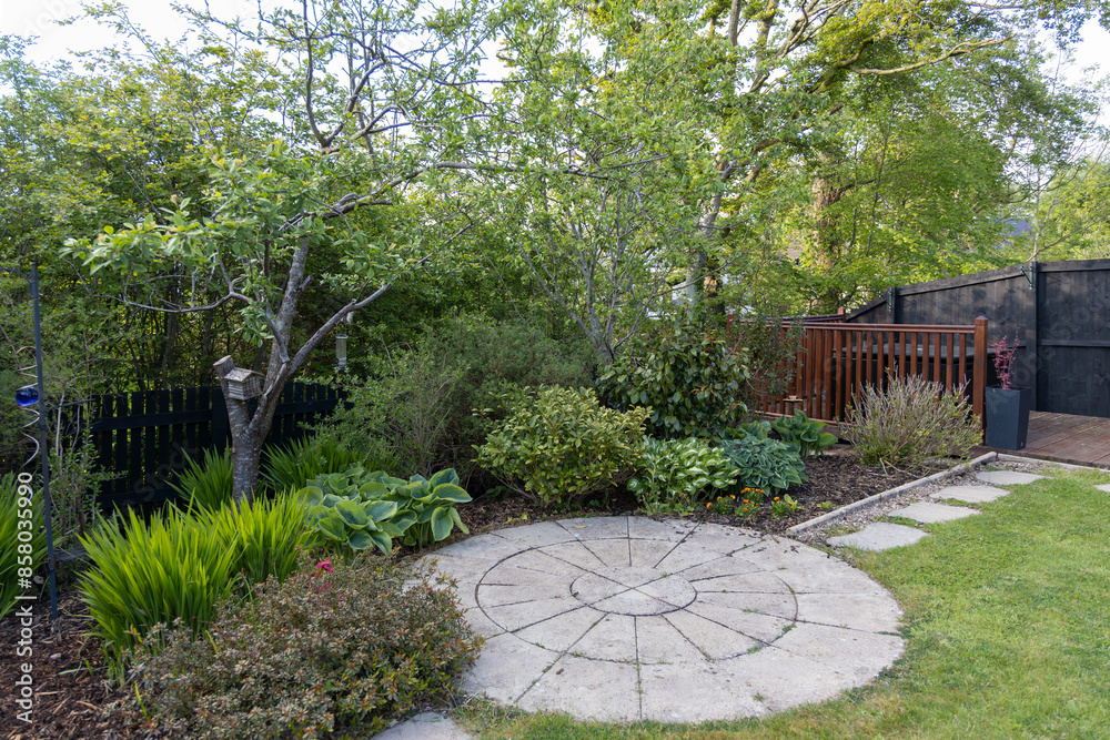 Samolepka Patio circle stepping stones decking area summer garden with lawn shrubs trees