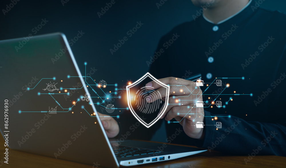 Samolepka Businessmen Fingerprint scanning and biometric authentication,Internet security and data protection concept