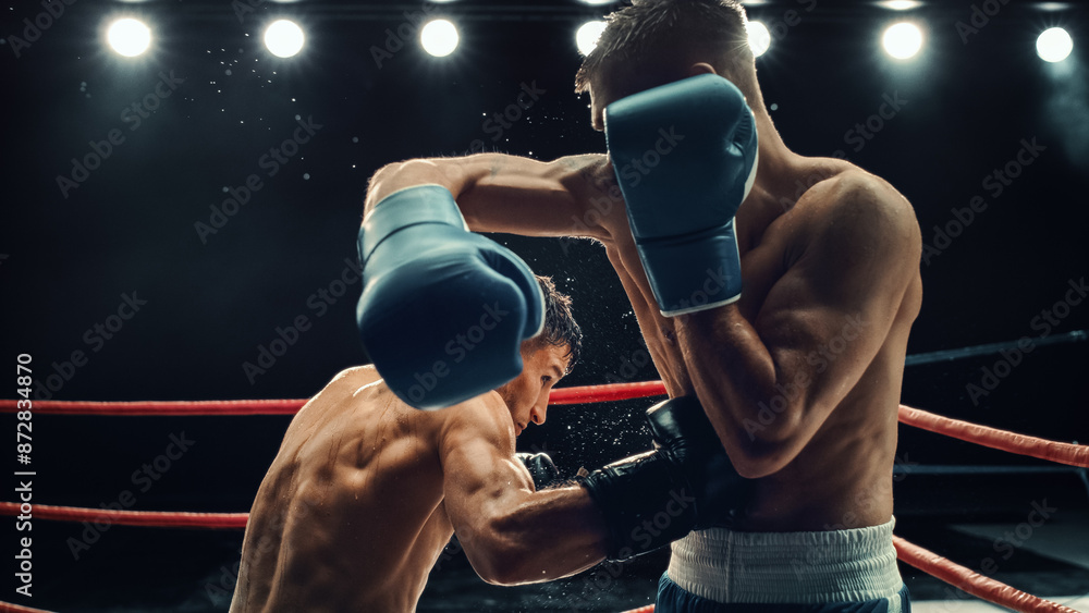 Samolepka Two Male Boxers in High-stakes Match, Exchanging Powerful Blows Under Intense Lighting
