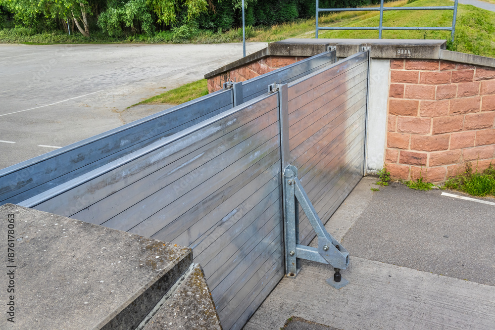 Samolepka Modern flood barrier on a road, flood gates protecting city against flooding