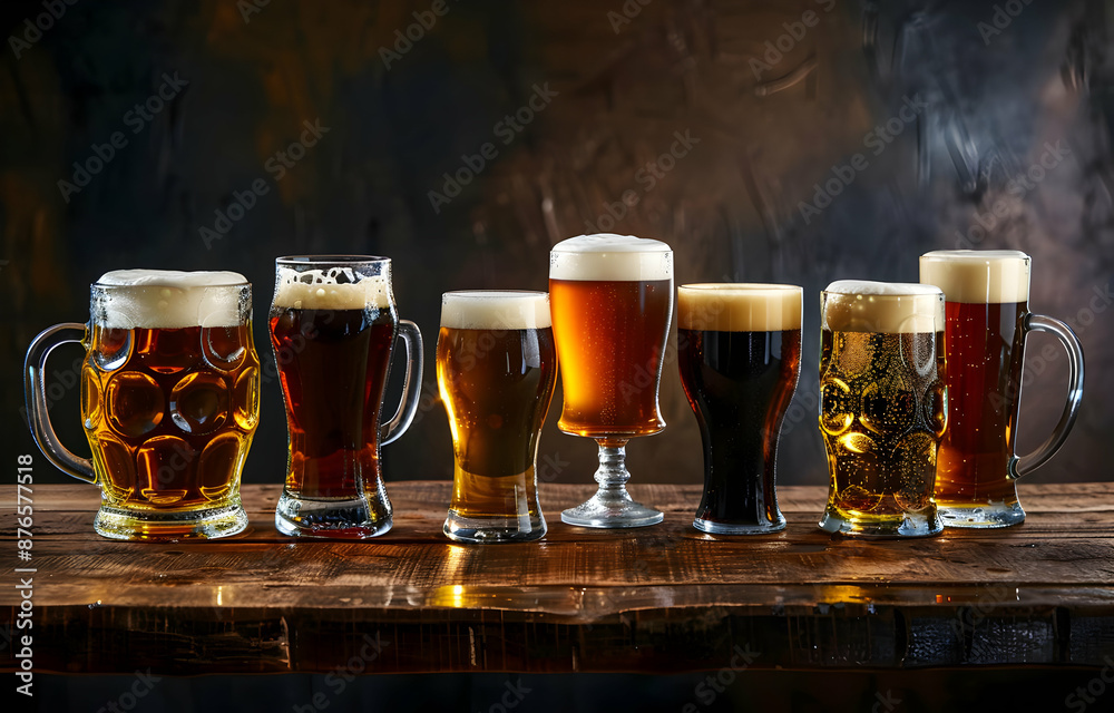Samolepka A variety of craft beers in different glasses on a wooden table against a dark background, perfect for a pub or brewery themed image