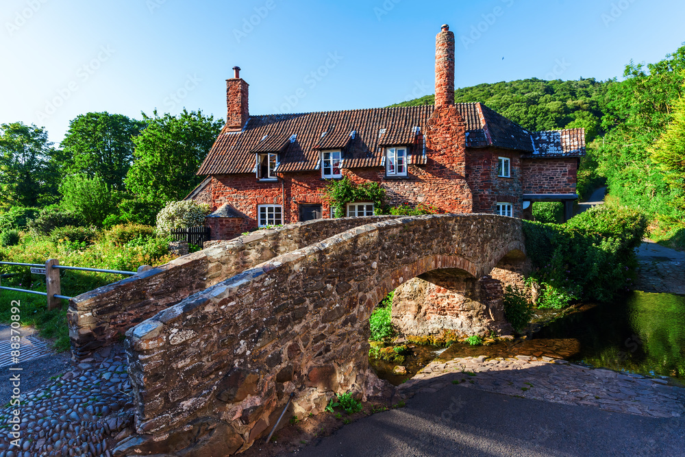 Samolepka malerisches Cottage mit Packpferdbrücke in Allerford, Somerset, England
